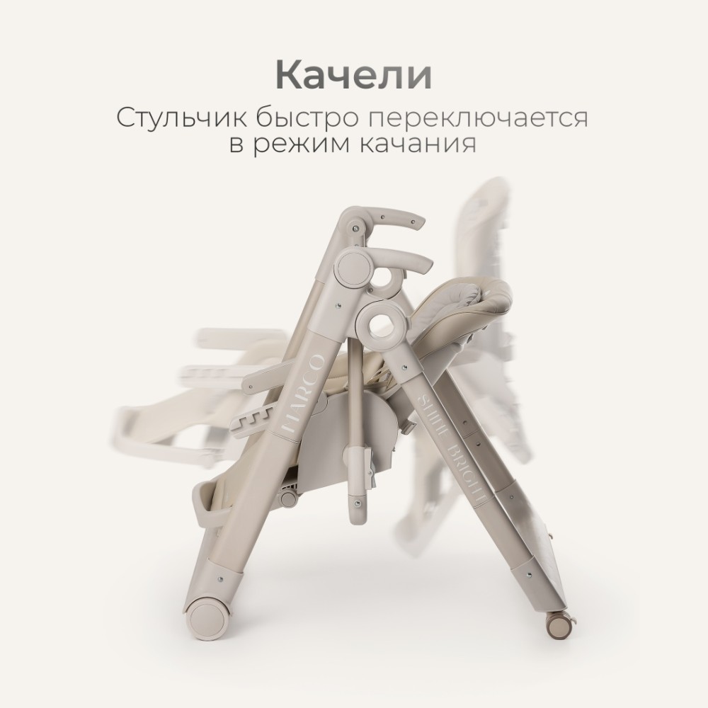 Стул для кормления-шезлонг Tomix Marco сочетает комфорт, безопасность и функциональность для ежедневного ухода за малышом. Модель оснащена механической функцией качания, позволяющей плавно укачивать ребенка без лишних усилий. Задние поворотные колёса с тормозным механизмом обеспечивают удобное перемещение стула и надежную фиксацию на месте.